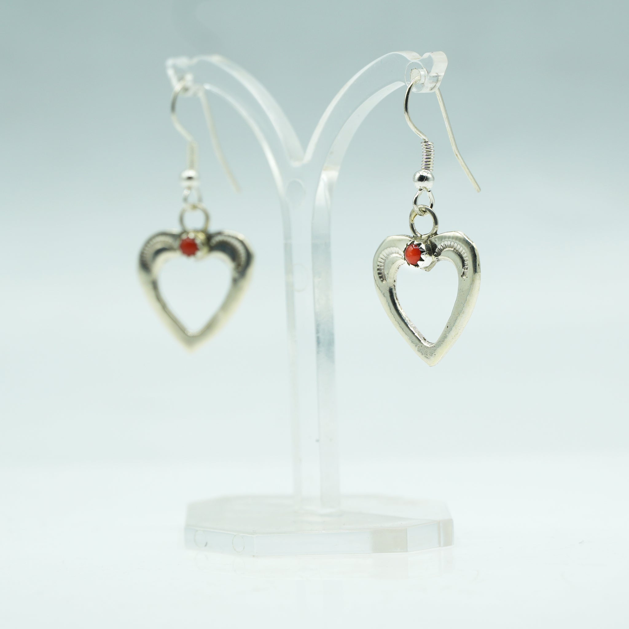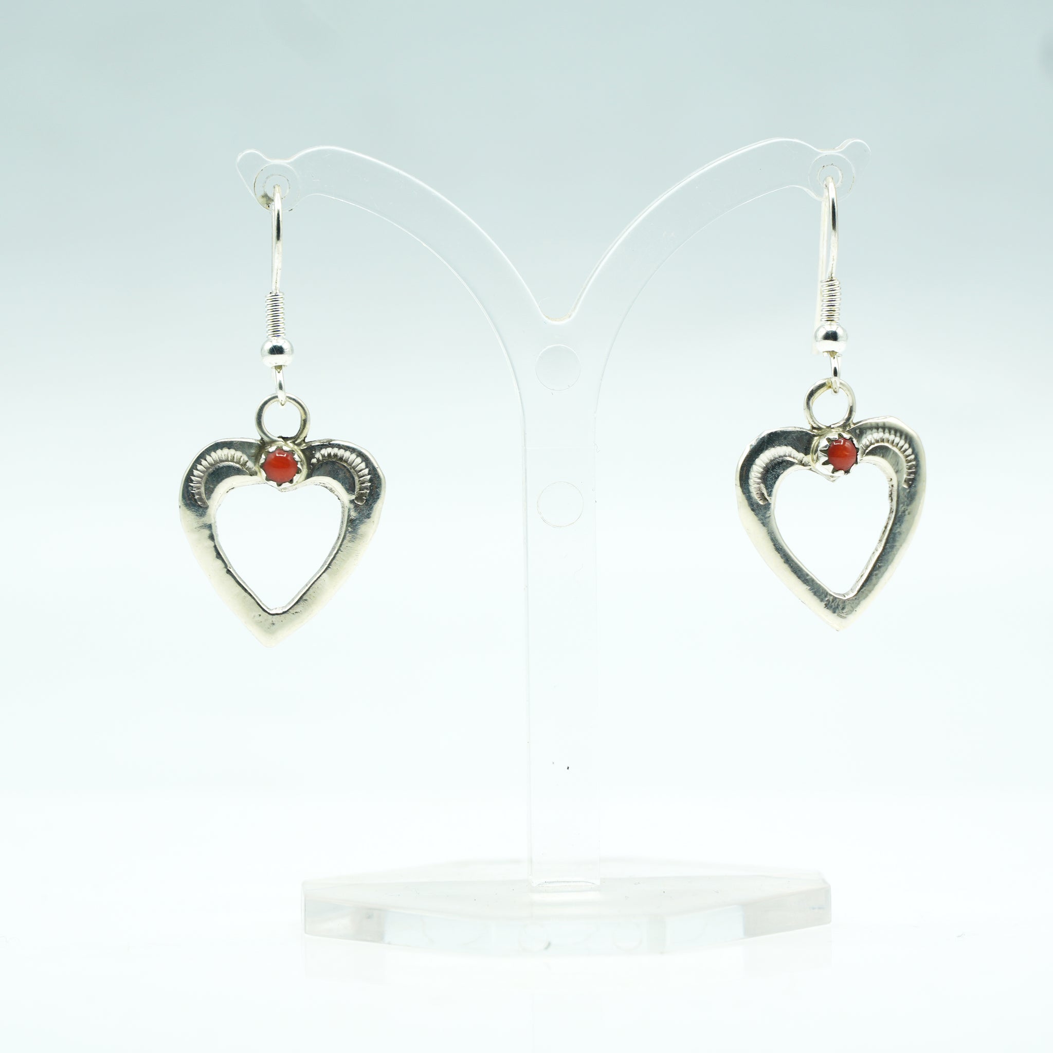 These handcrafted Zuni earrings feature an elegant open-heart design in sterling silver, accented with a single piece of vibrant red coral. The heart—a symbol of devotion and connection—is beautifully framed by subtle stamped detailing, showcasing the refined craftsmanship the Zuni are cherished for. The coral adds a warm, lively touch, traditionally valued for vitality, protection, and the spark of life it represents. Light, graceful, and timeless, these earrings carry both beauty and meaning in equal measure.