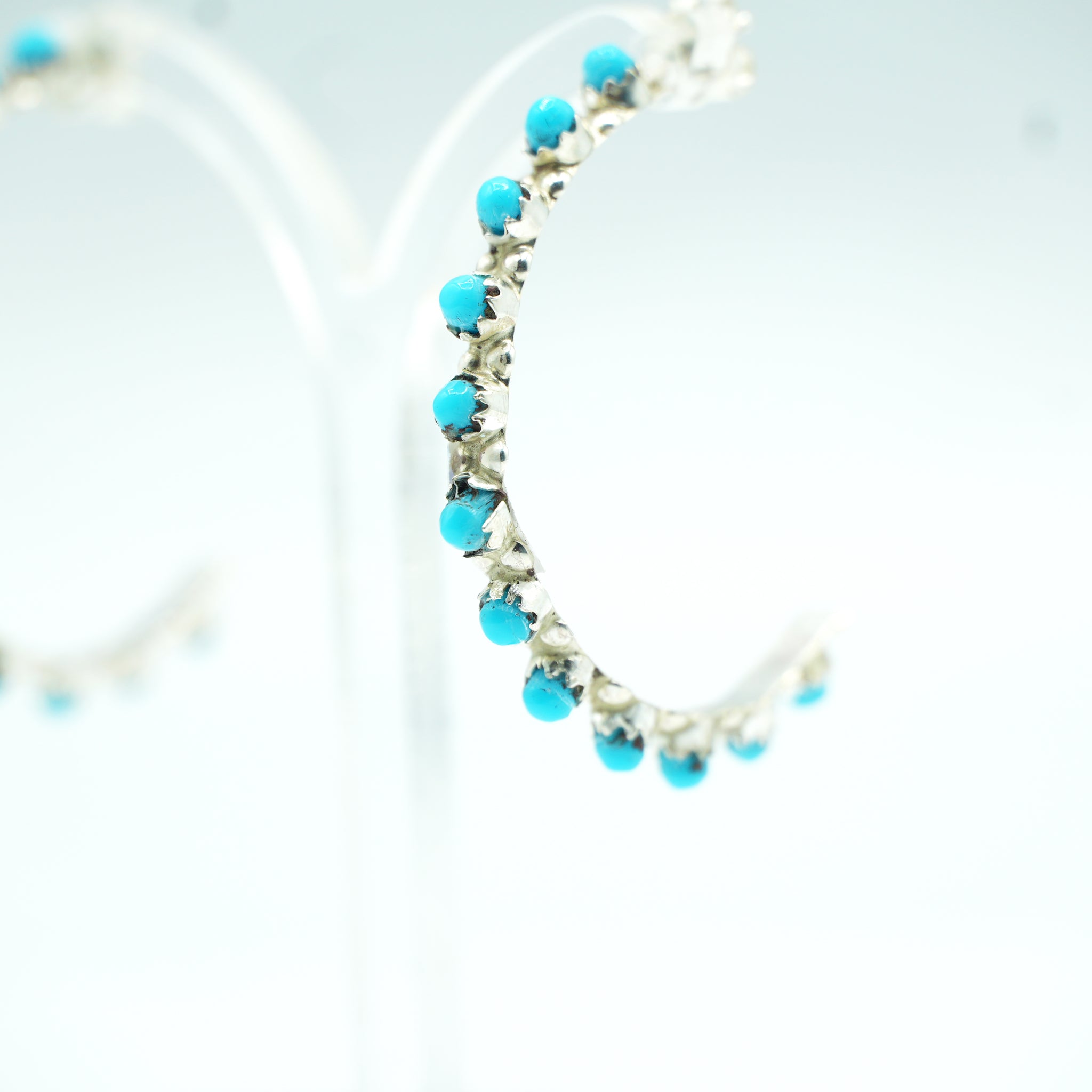These stunning Zuni hoop earrings are crafted in sterling silver and adorned with a continuous row of petite turquoise cabochons, each stone hand-cut and delicately set in traditional petit point style. The bright blue stones create a vivid, rhythmic arc of color, showcasing the precision and artistry the Zuni people are celebrated for. Lightweight yet striking, these hoops offer a perfect blend of elegance, movement, and timeless Southwestern charm.