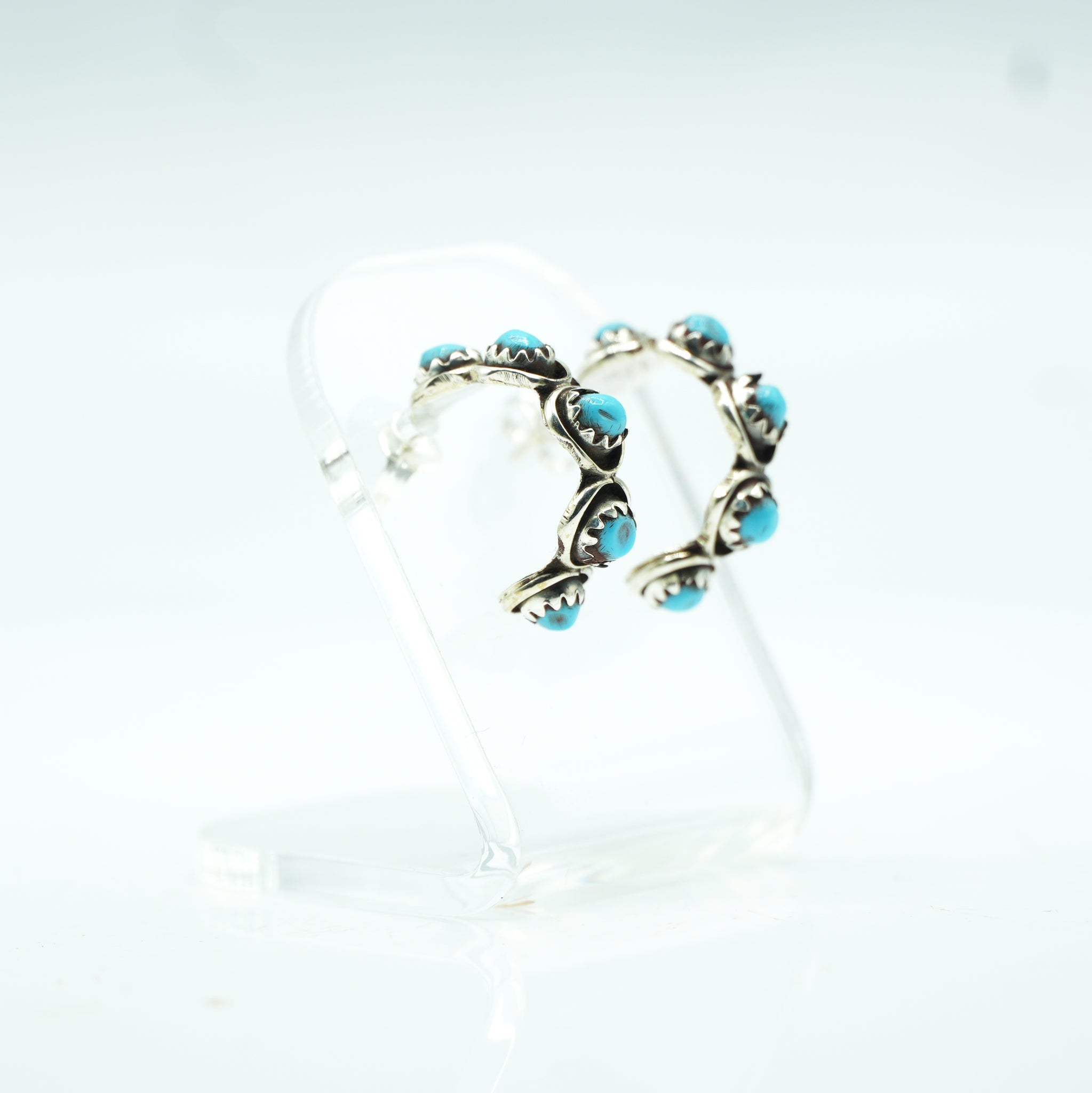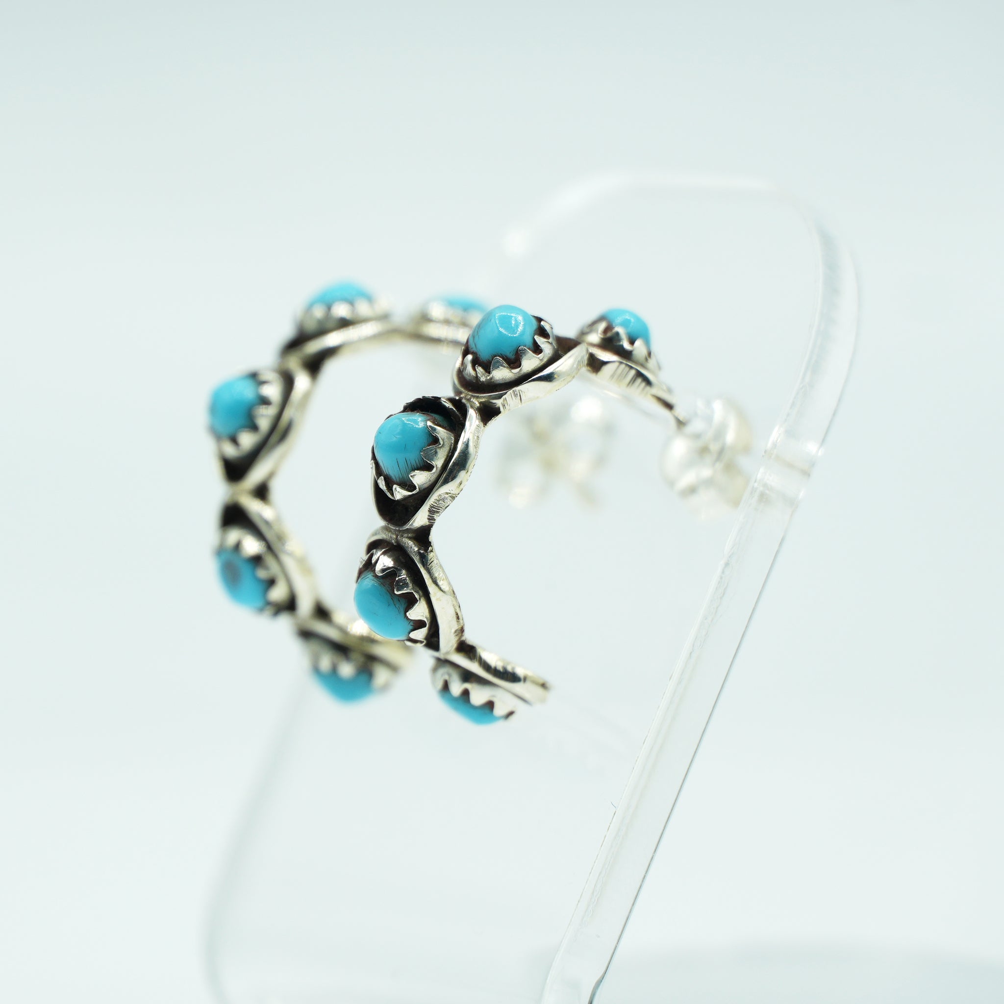 These beautifully crafted Zuni hoop earrings feature a continuous row of hand-set turquoise cabochons framed in scalloped sterling silver bezels. Each stone is individually shaped and placed, forming a vibrant ring of sky-blue color that reflects the meticulous artistry the Zuni are renowned for. The design is both delicate and striking, offering a timeless Southwestern style with graceful movement and classic handcrafted charm.