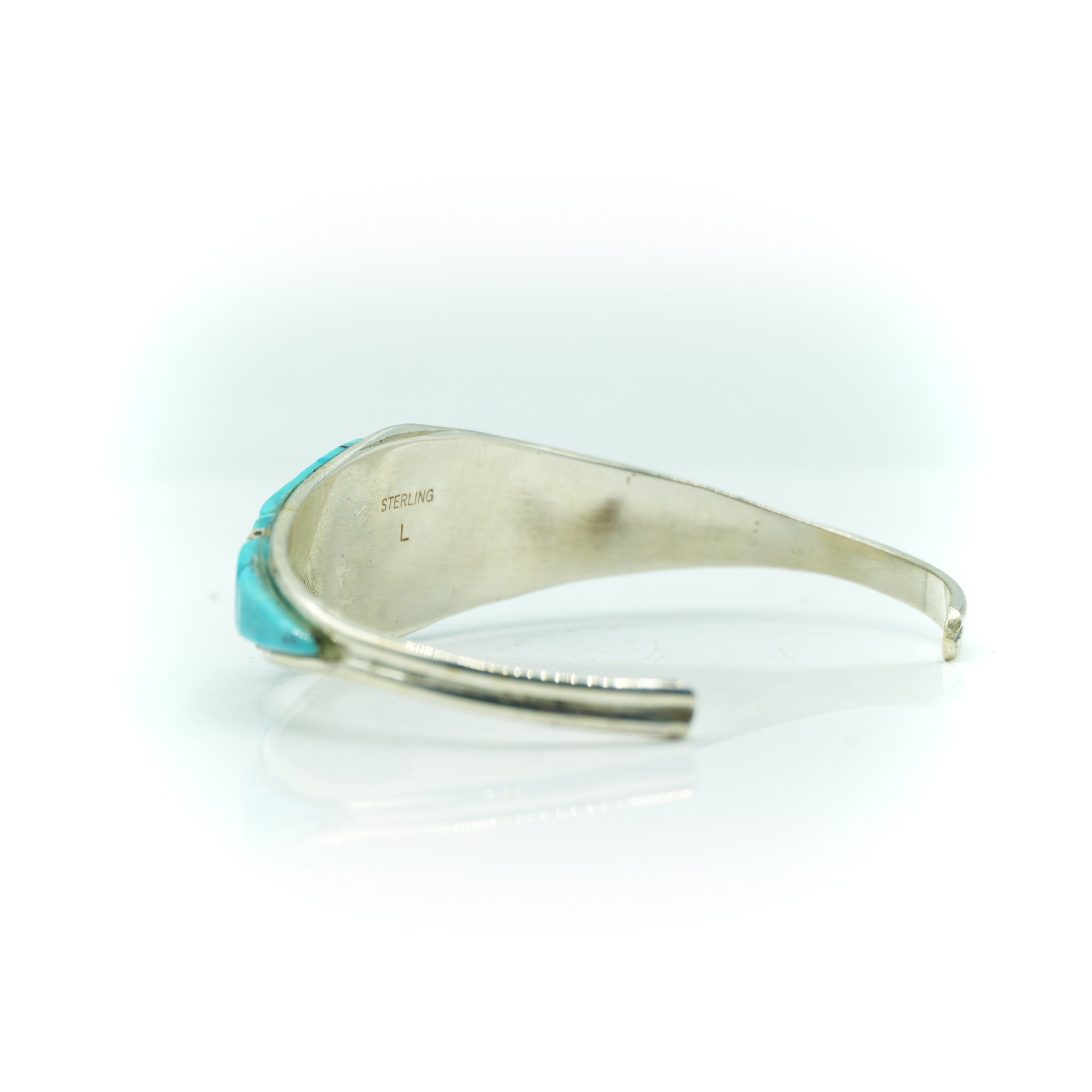 This handcrafted Navajo cuff bracelet features a striking geometric inlay of vibrant turquoise and rich spiny oyster shell, set seamlessly into a polished sterling silver frame. The bold, angular mosaic design highlights the skill and precision of Navajo silversmiths, creating a piece that blends traditional artistry with a clean, modern aesthetic. The slim band and tapered form give it an elegant, wearable profile suitable for everyday wear or layering.