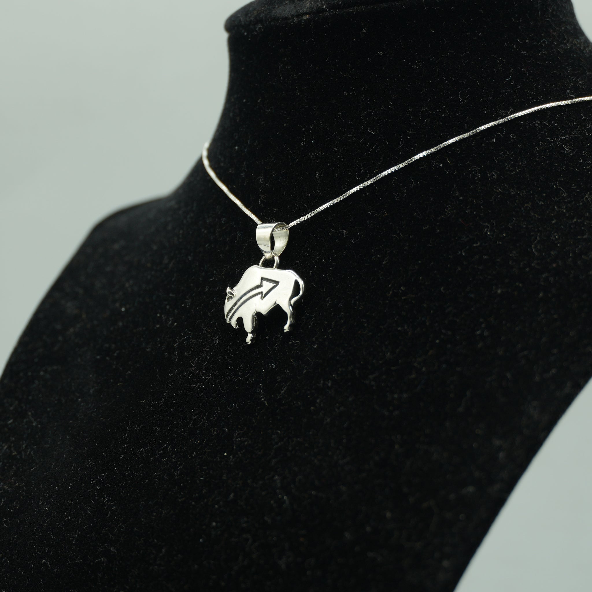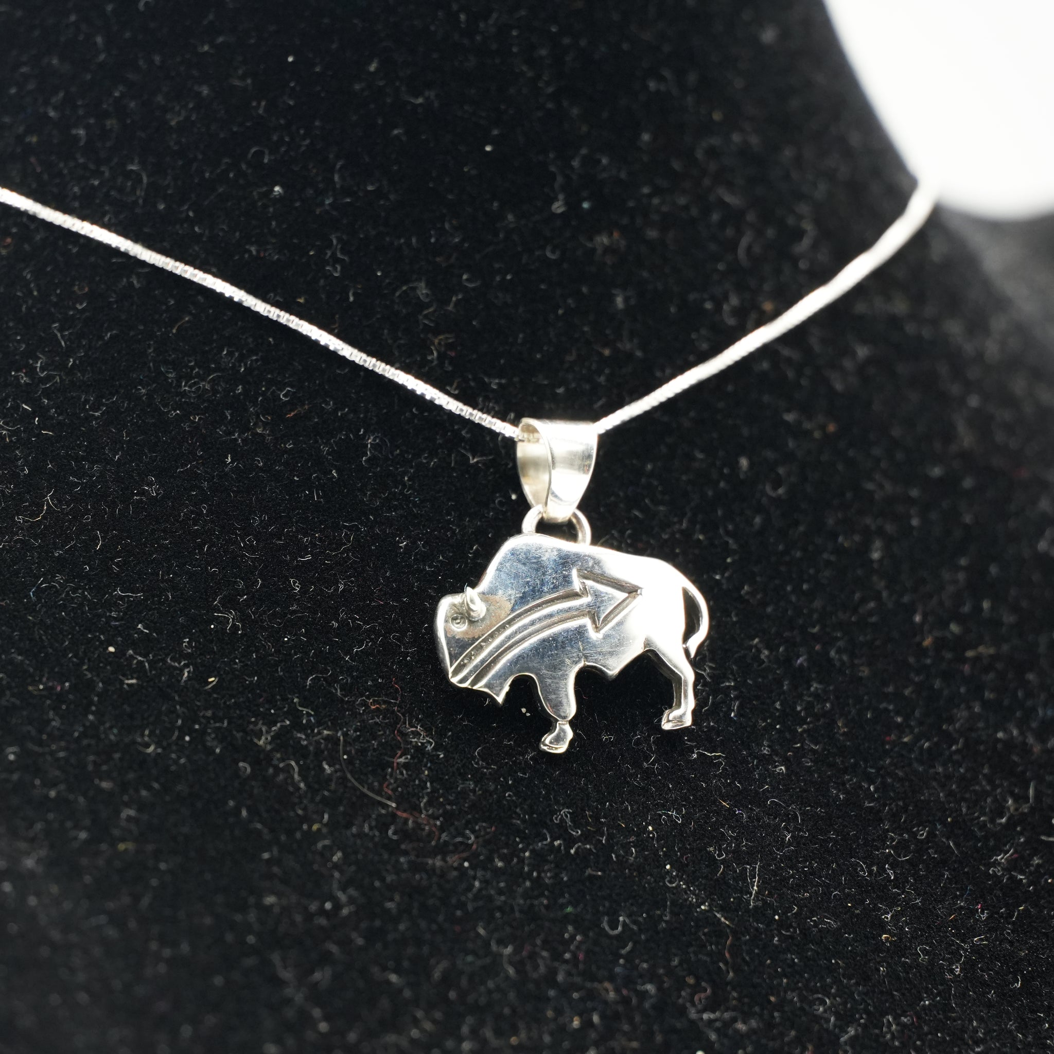 This handcrafted Zuni sterling silver pendant features a bold buffalo silhouette, accented with a clean, sculpted arrow motif across its body. The polished surface and finely cut details give the piece a strong, grounded presence while maintaining the classic elegance of traditional Zuni silverwork.