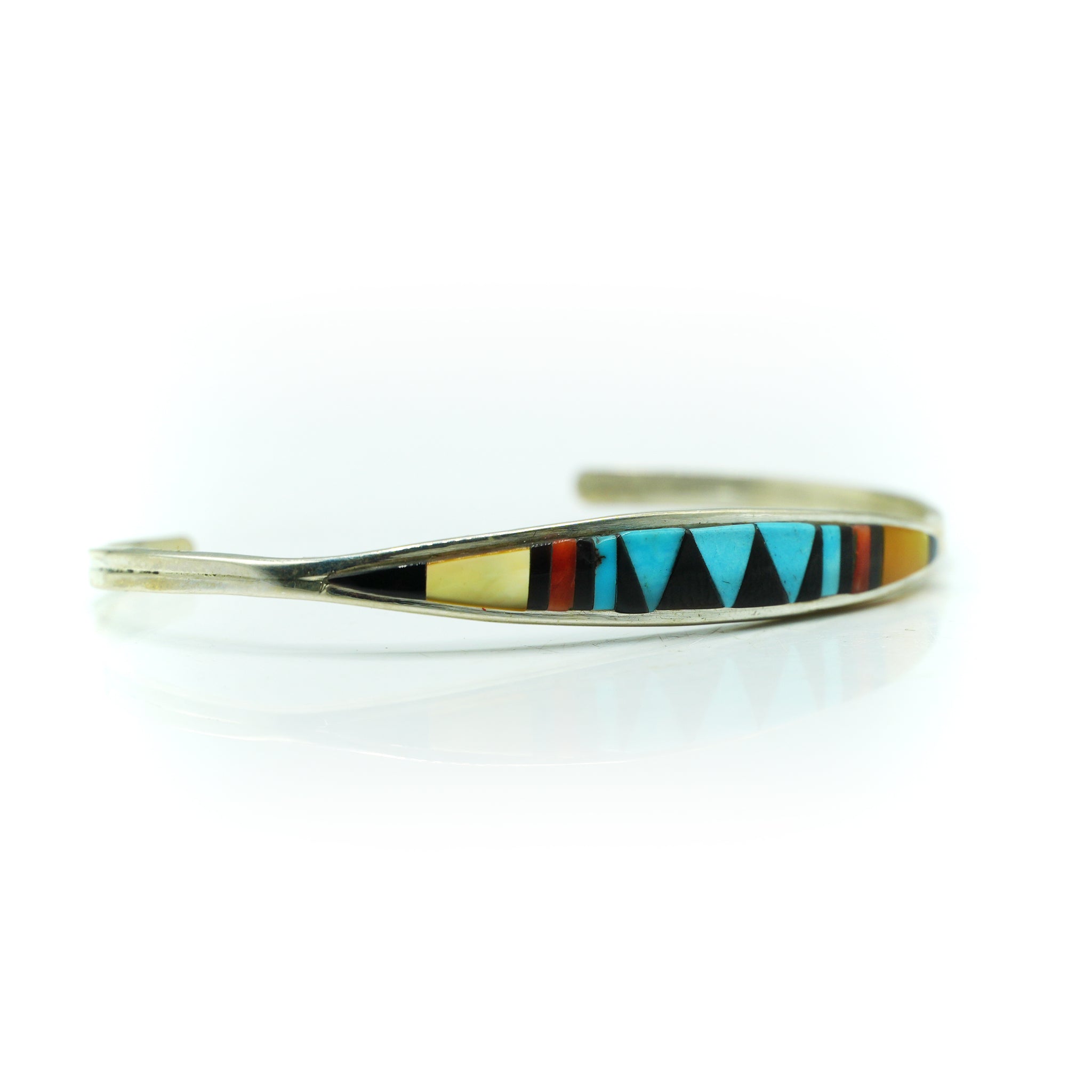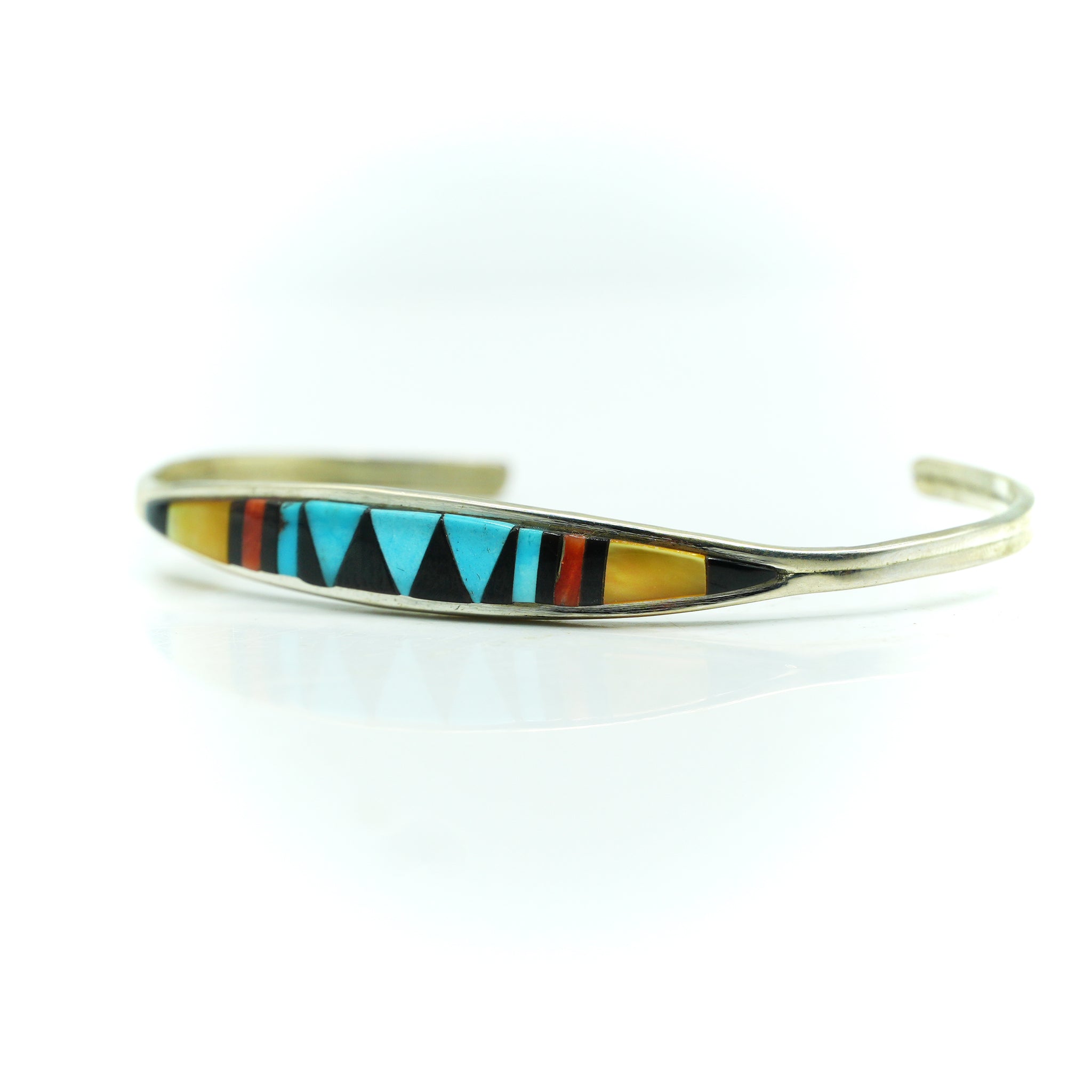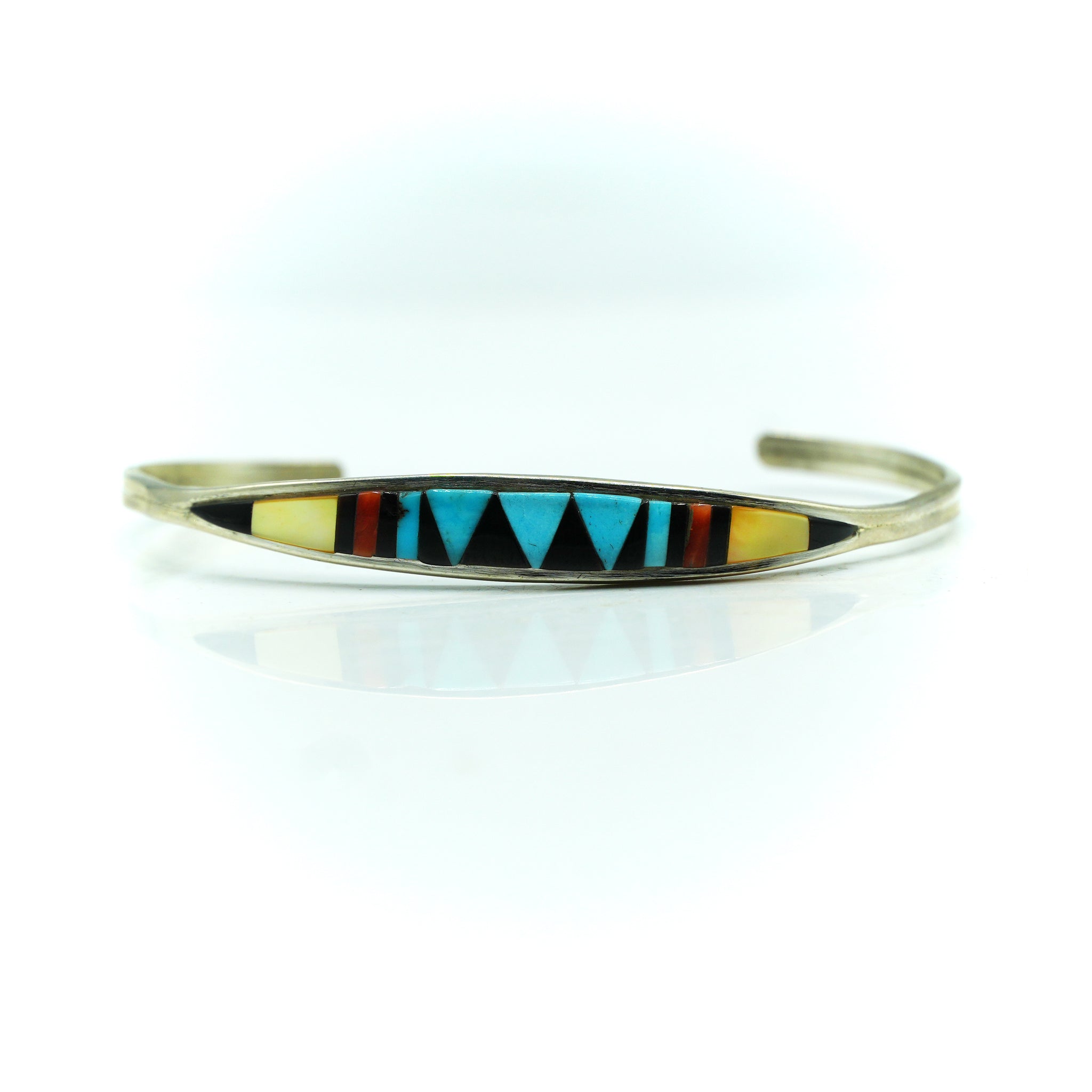 Channel Inlay is most commonly found within Zuni mixed stone jewellery. Silver Channel Inlay is a variation of Mosaic Inlay, in this method, the artisan creates soldered silver compartments within the base piece of the jewellery, the artist then individually cuts each stone to perfectly fit within these compartments, known as channels. The integrity of the stones and the aesthetics of the piece are strengthened by this technique.