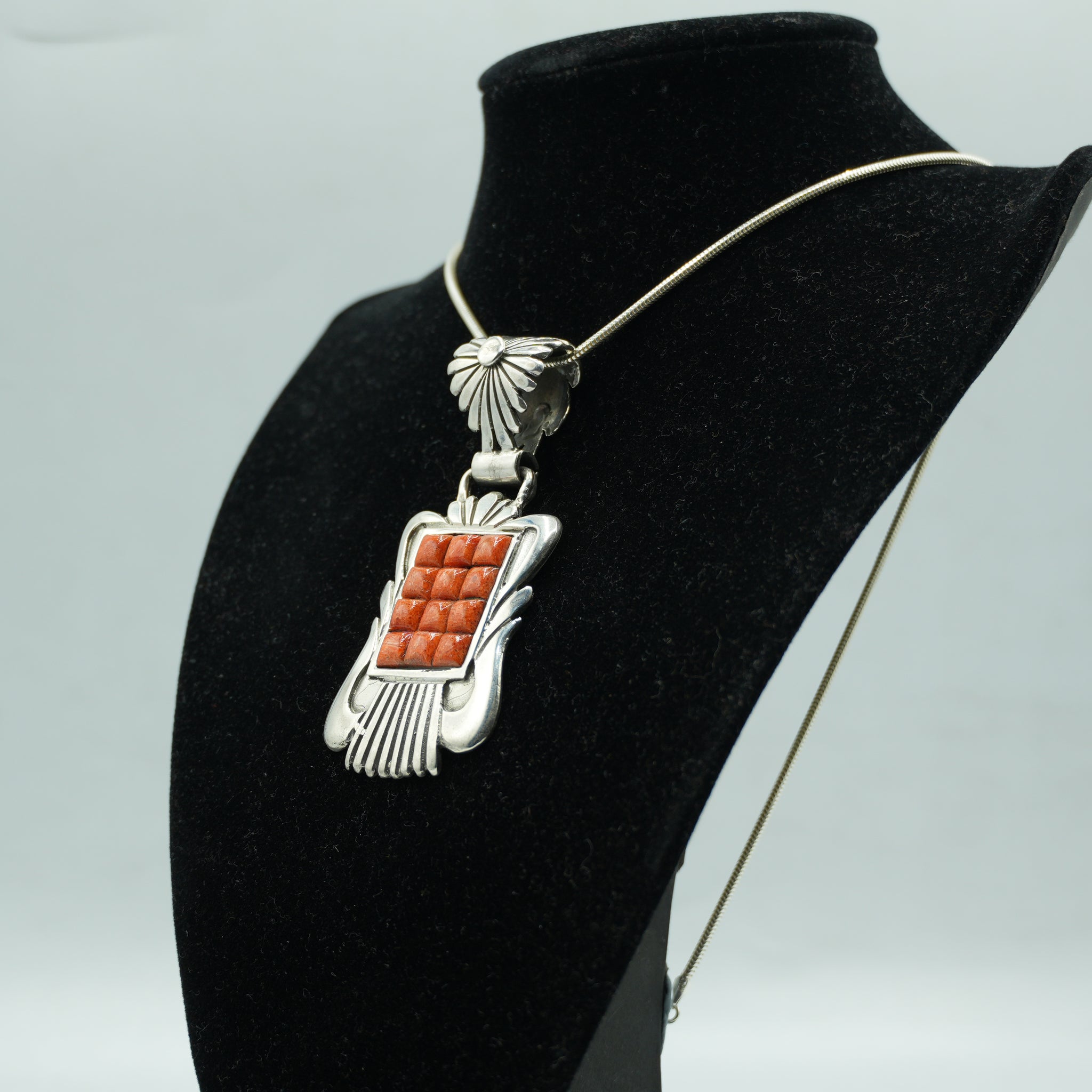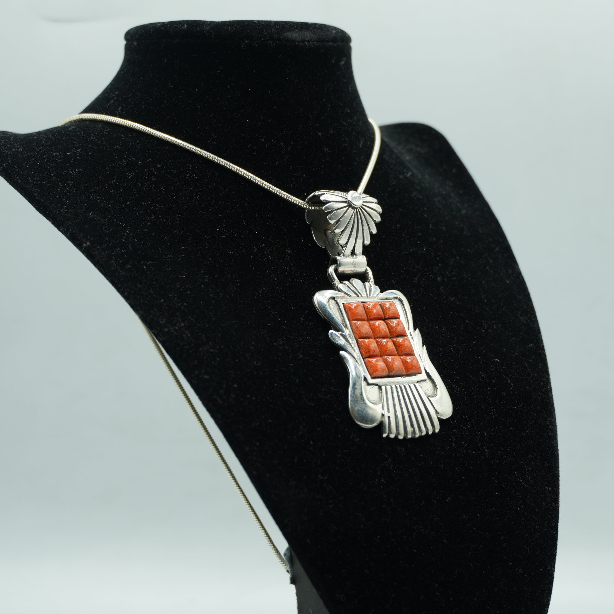 This bold handcrafted Zuni pendant features a striking grid-style cluster of rich orange spiny oyster shell set in sterling silver. The stonework is arranged in meticulously carved, raised squares that give the piece dimension and texture, framed by an ornate traditional Zuni silver design with fan and feather-like sculpting. The hinged bail adds movement and an elevated artisan touch.