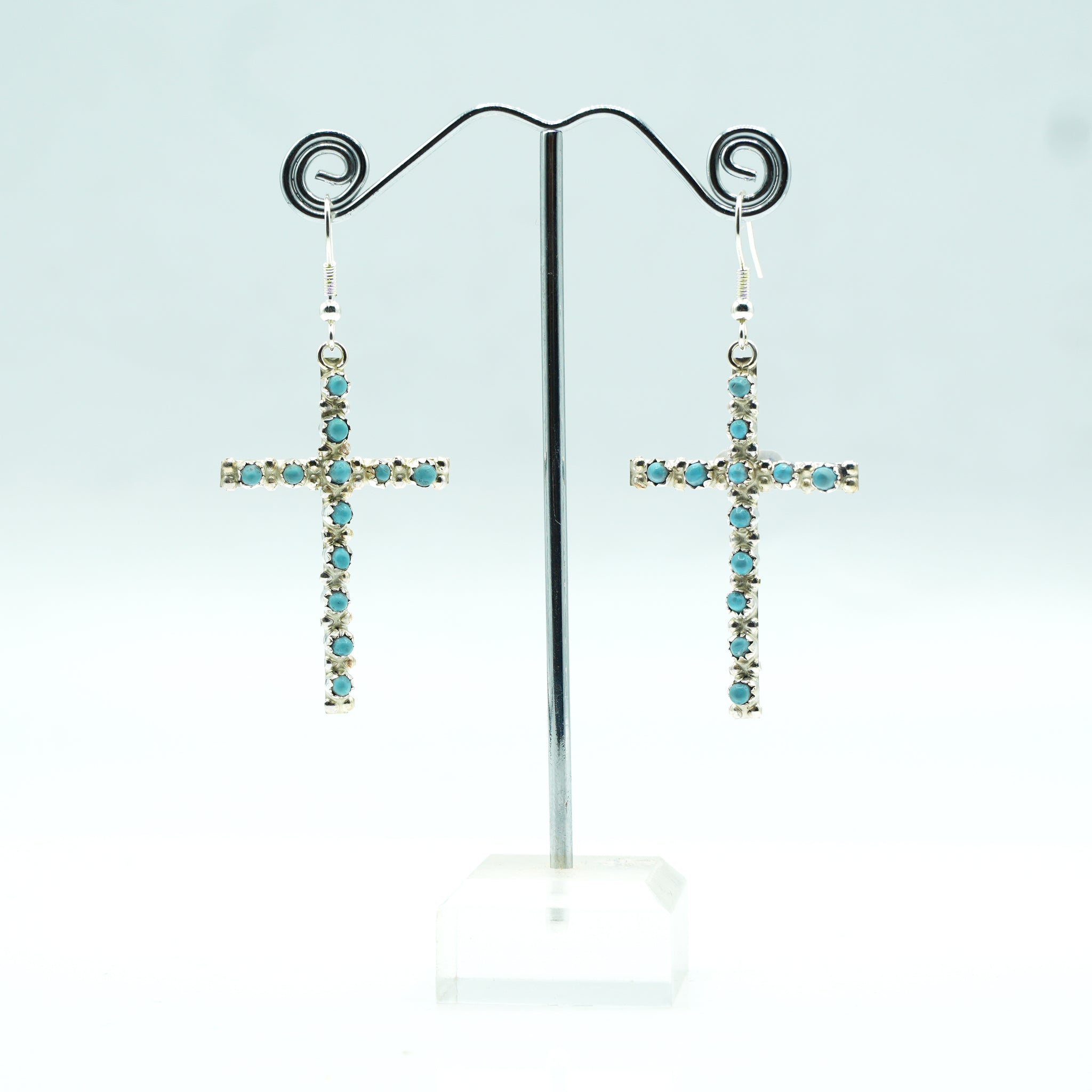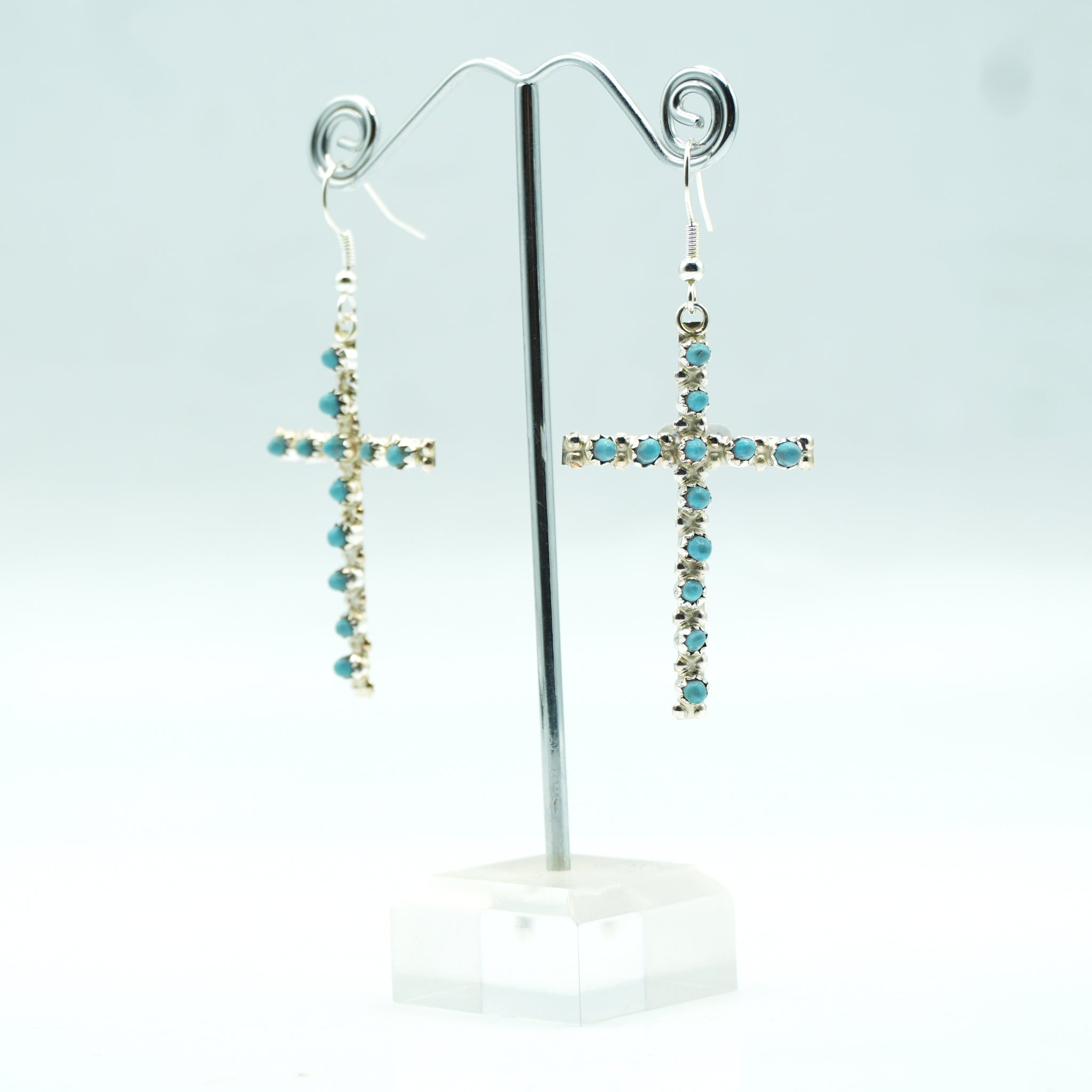 These striking Zuni earrings feature long sterling silver crosses adorned with rows of hand-cut turquoise cabochons. Each stone is individually set in traditional serrated bezels, creating a radiant line of sky-blue color that highlights the precision and beauty of Zuni craftsmanship. The elongated design gives the earrings elegant movement and a bold presence, blending spiritual symbolism with timeless Southwestern style.