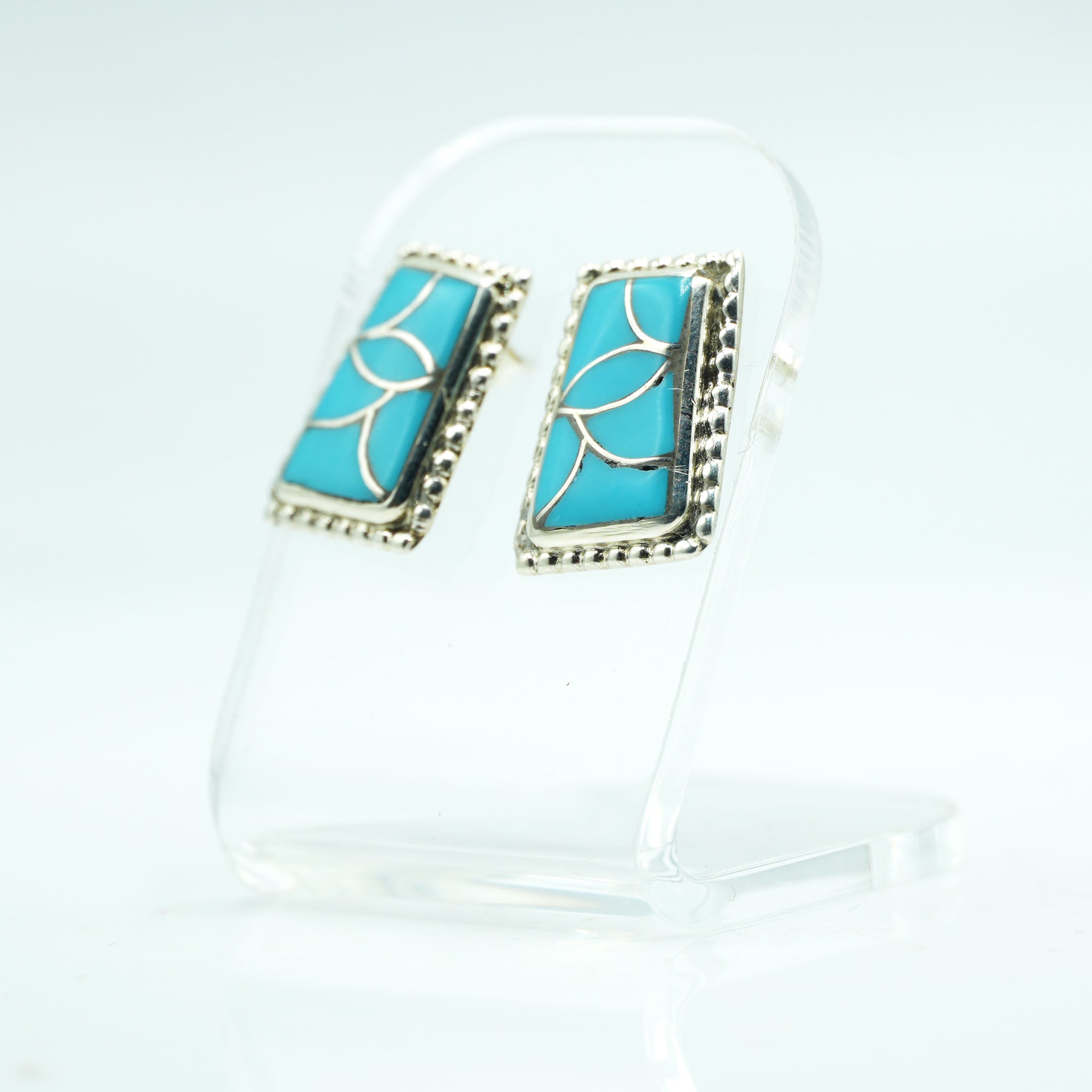 These elegant Zuni earrings feature rectangular turquoise panels inlaid with graceful sterling silver lines, forming a soft geometric pattern that reflects the refined artistry of Zuni silversmiths. Framed with a traditional beaded silver border, each earring highlights the vivid sky-blue color of the turquoise while adding depth and texture through the detailed craftsmanship. Sleek, balanced, and timeless, they offer a sophisticated Southwestern look perfect for everyday wear or special occasions.
