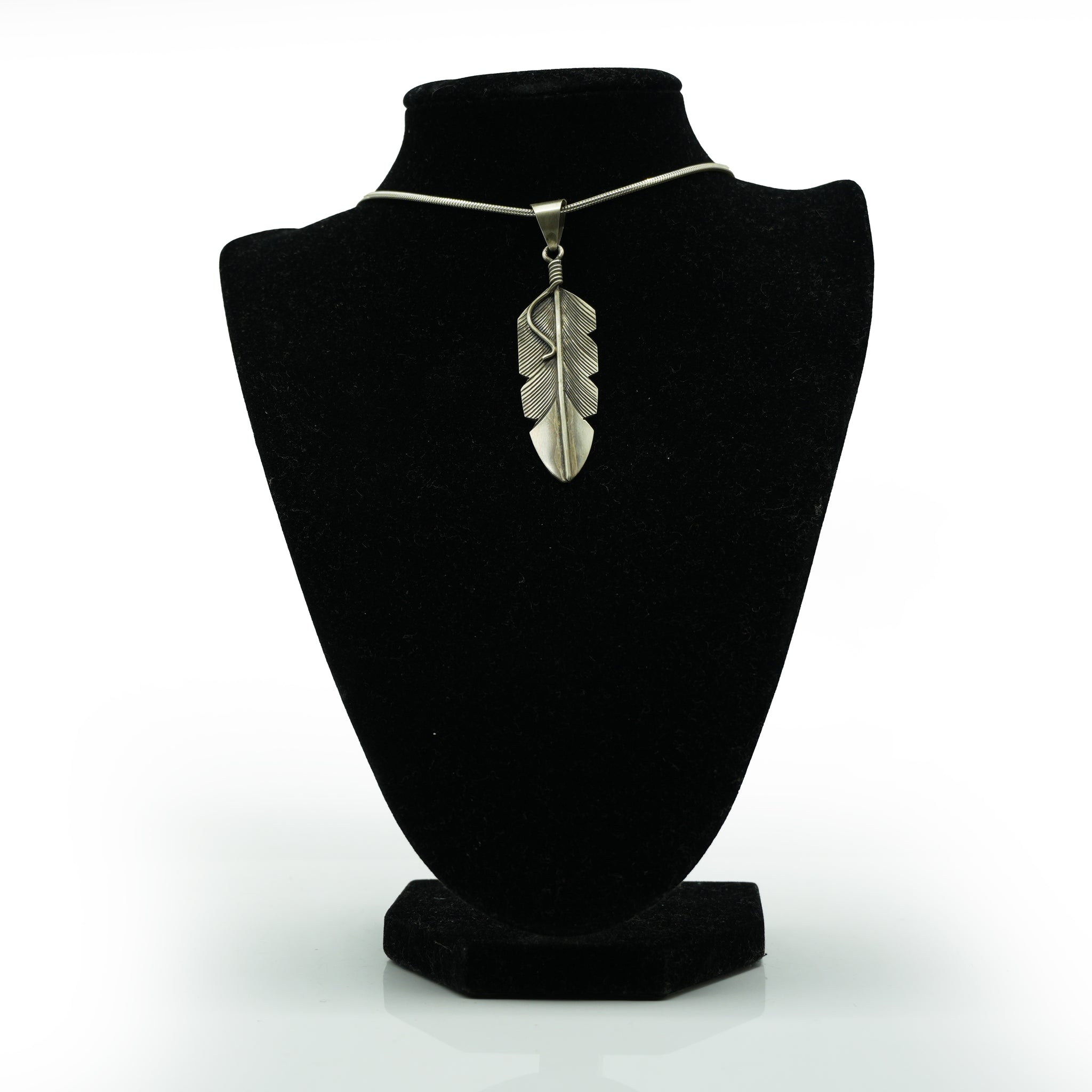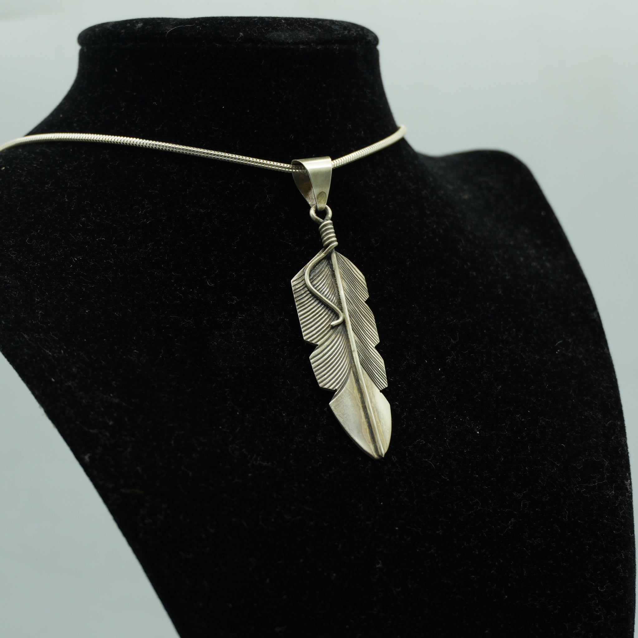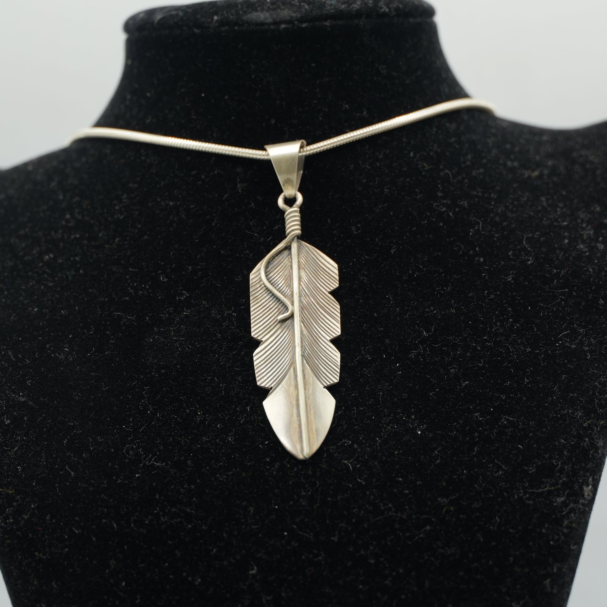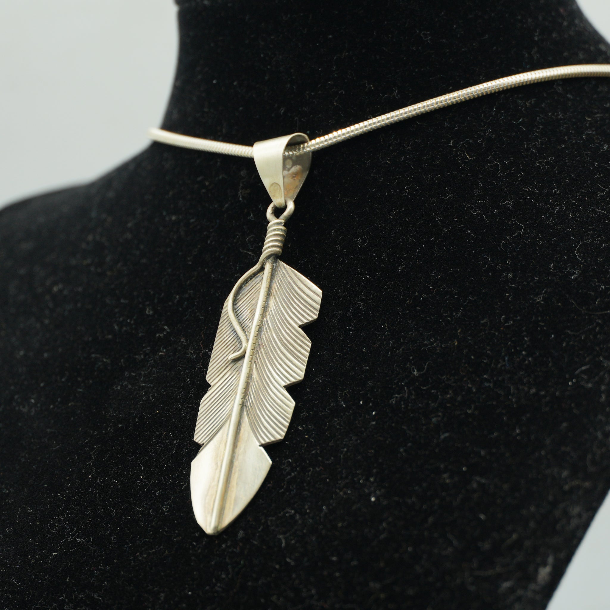 This handcrafted Zuni sterling silver feather pendant showcases bold, detailed engraving along the vane and shaft. The stepped edging gives the feather a strong geometric character while still keeping the natural softness and flow of a traditional feather design. The wrapped silver wire detail at the top adds movement and dimension, highlighting the artisan’s skill and the cultural symbolism of feathers in Native jewelry. The chain is not included in this piece.