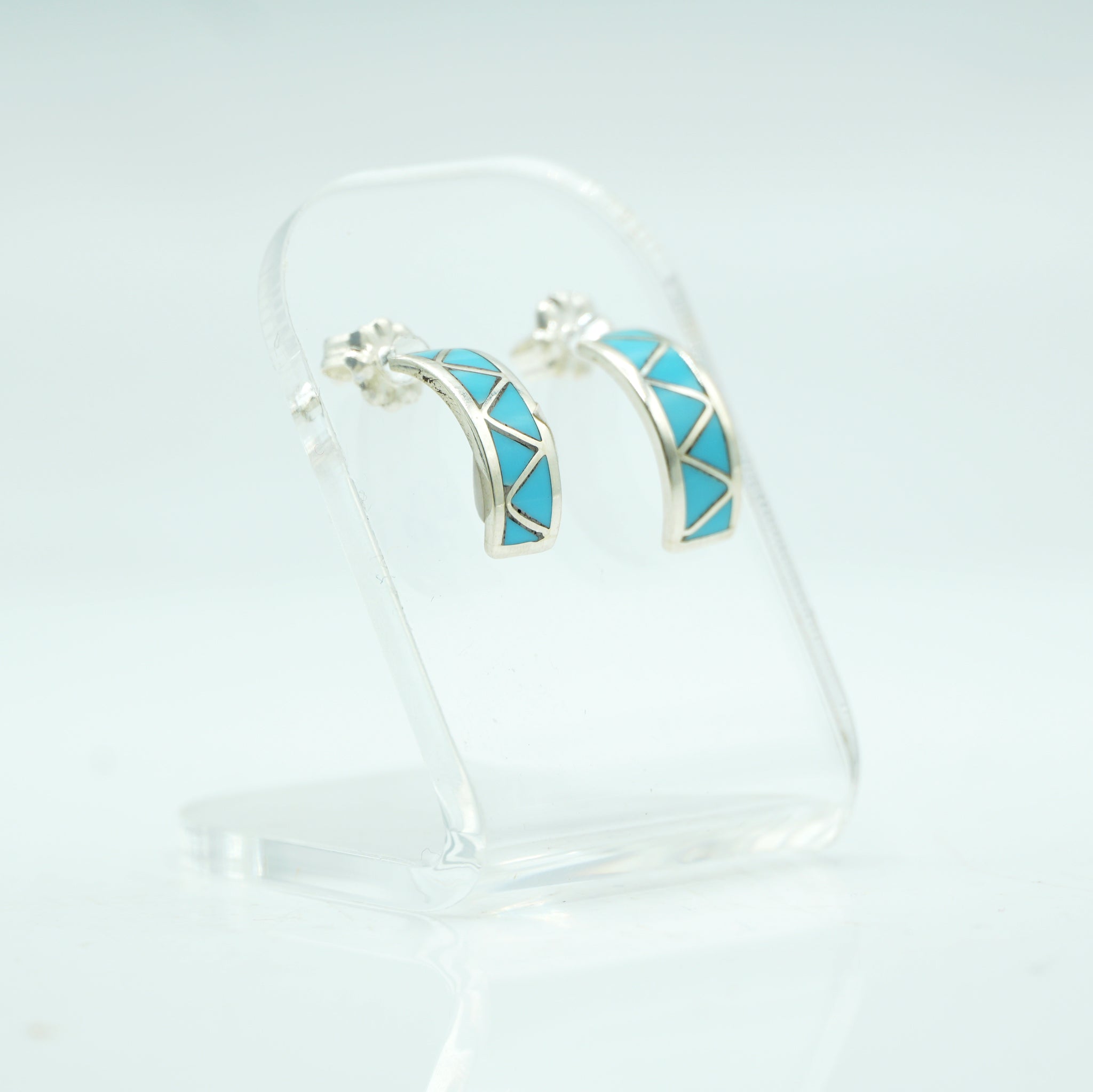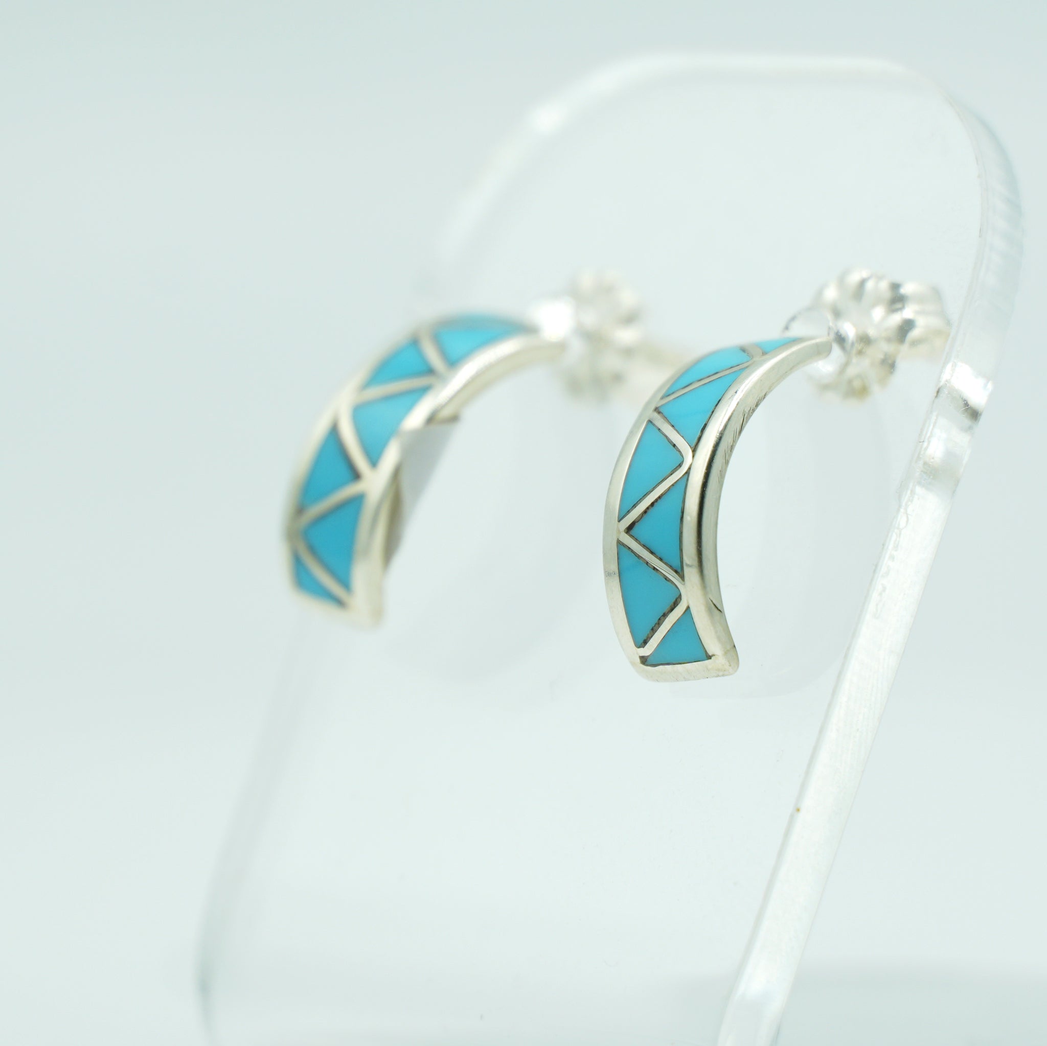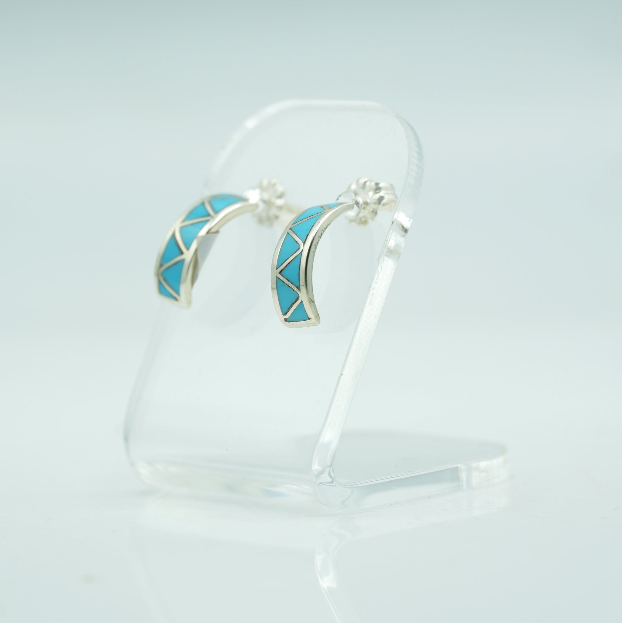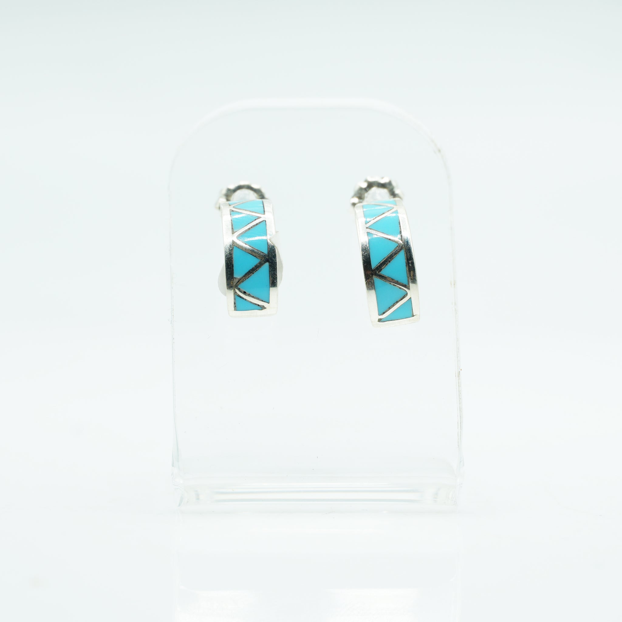 These beautifully crafted Zuni half-hoop earrings feature geometric turquoise inlay arranged in crisp triangular panels, each piece skillfully fitted into polished sterling silver. The clean lines of the design create a modern, balanced look while still honoring classic Zuni inlay traditions. Subtle beading along the edges adds texture and depth, making these hoops both refined and eye-catching—perfect for everyday wear or a subtle Southwestern statement.