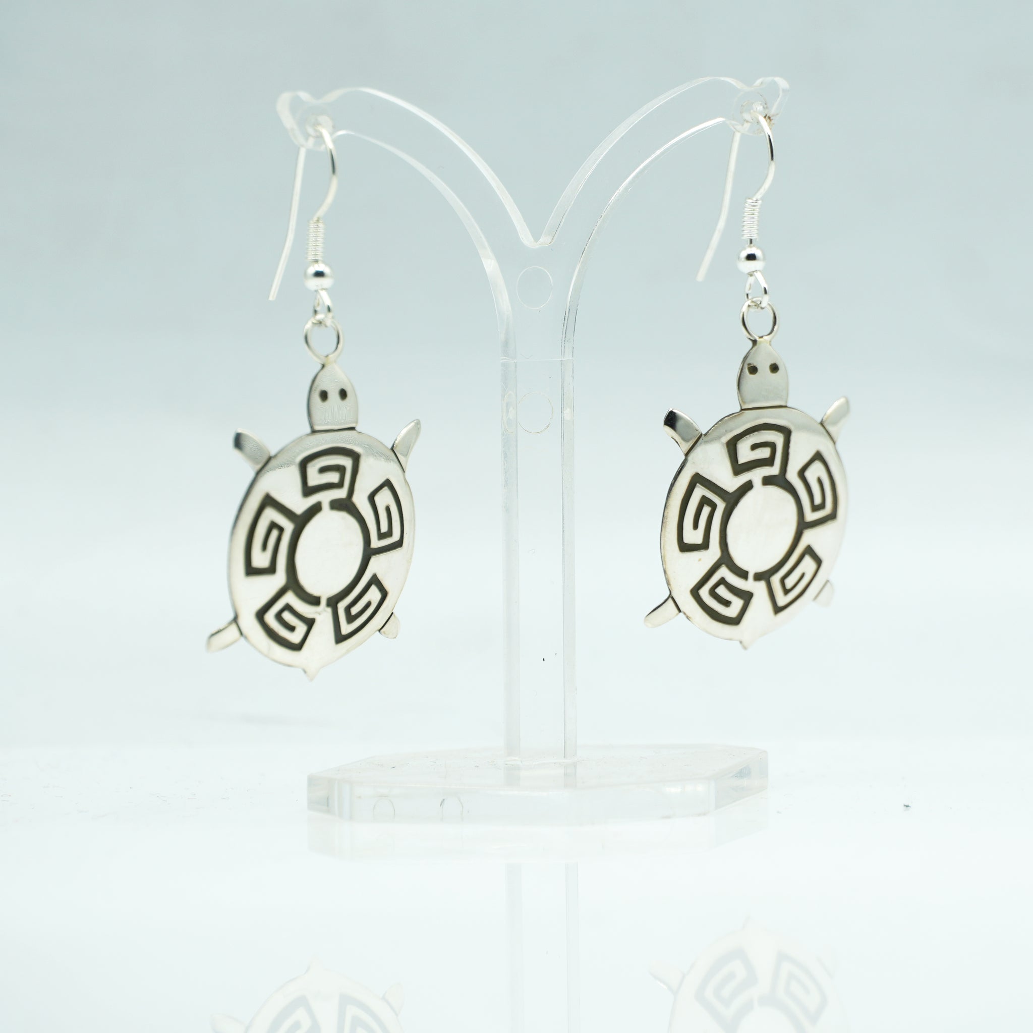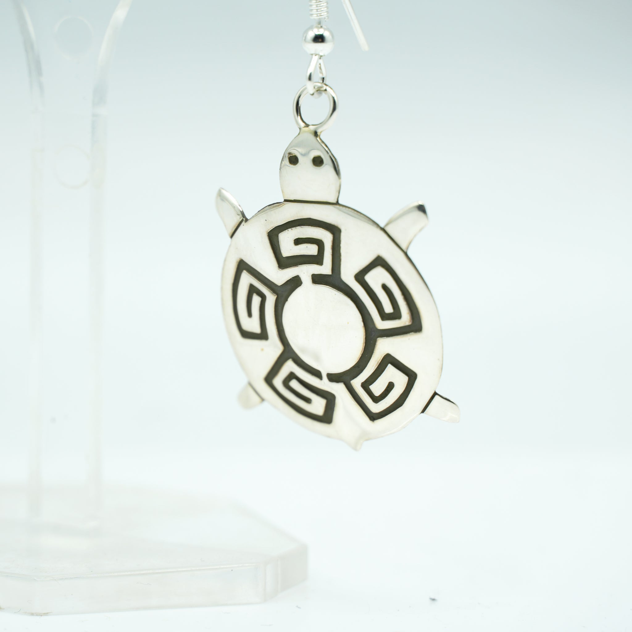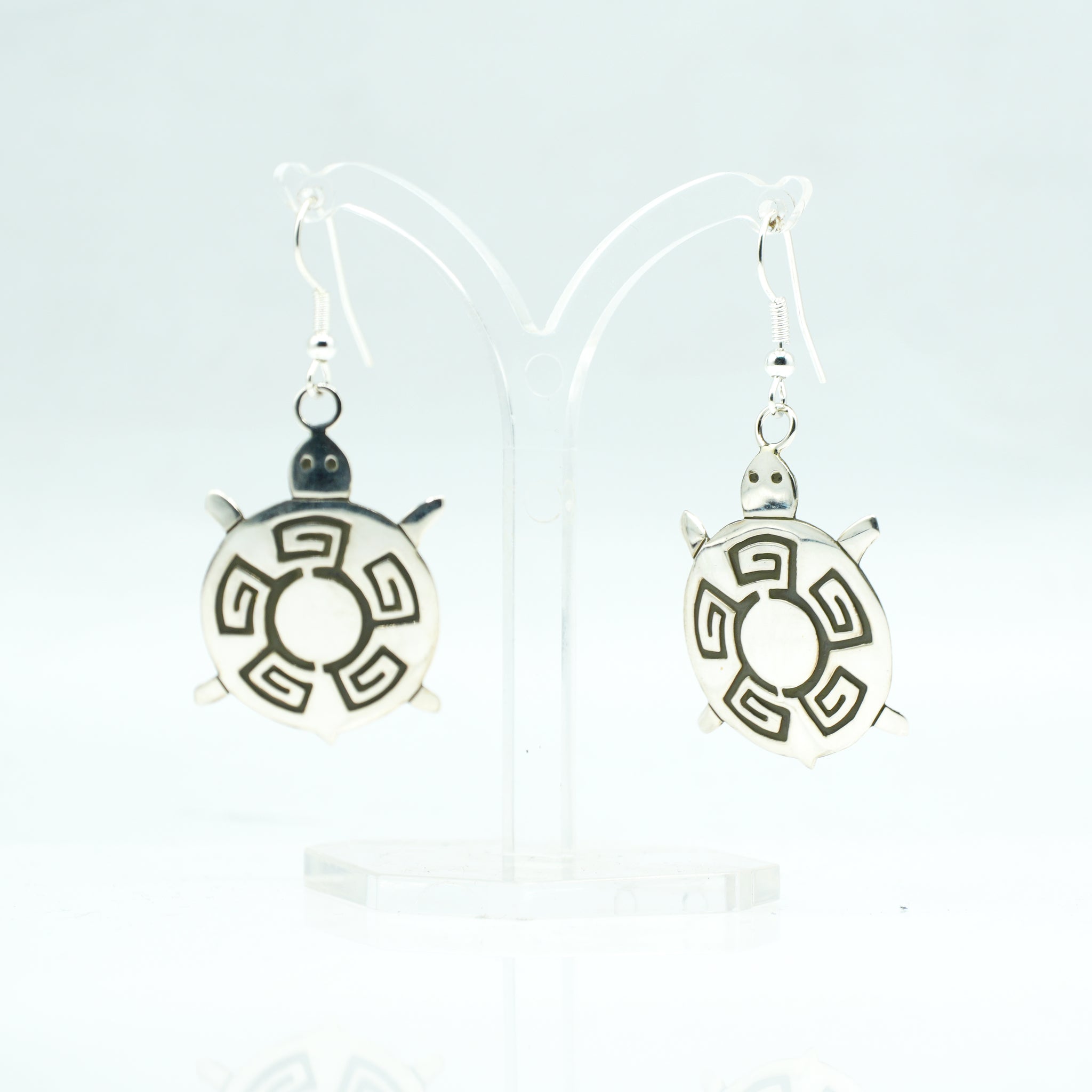 These charming Zuni earrings feature beautifully crafted sterling silver turtles, each with a bold geometric shell design inspired by traditional Native motifs. The clean cut-out pattern highlights the polished silver surface, while the simple, rounded form of the turtle body gives the earrings a friendly and timeless character. Lightweight and expressive, they offer a blend of cultural symbolism and artisan craftsmanship perfect for everyday wear.