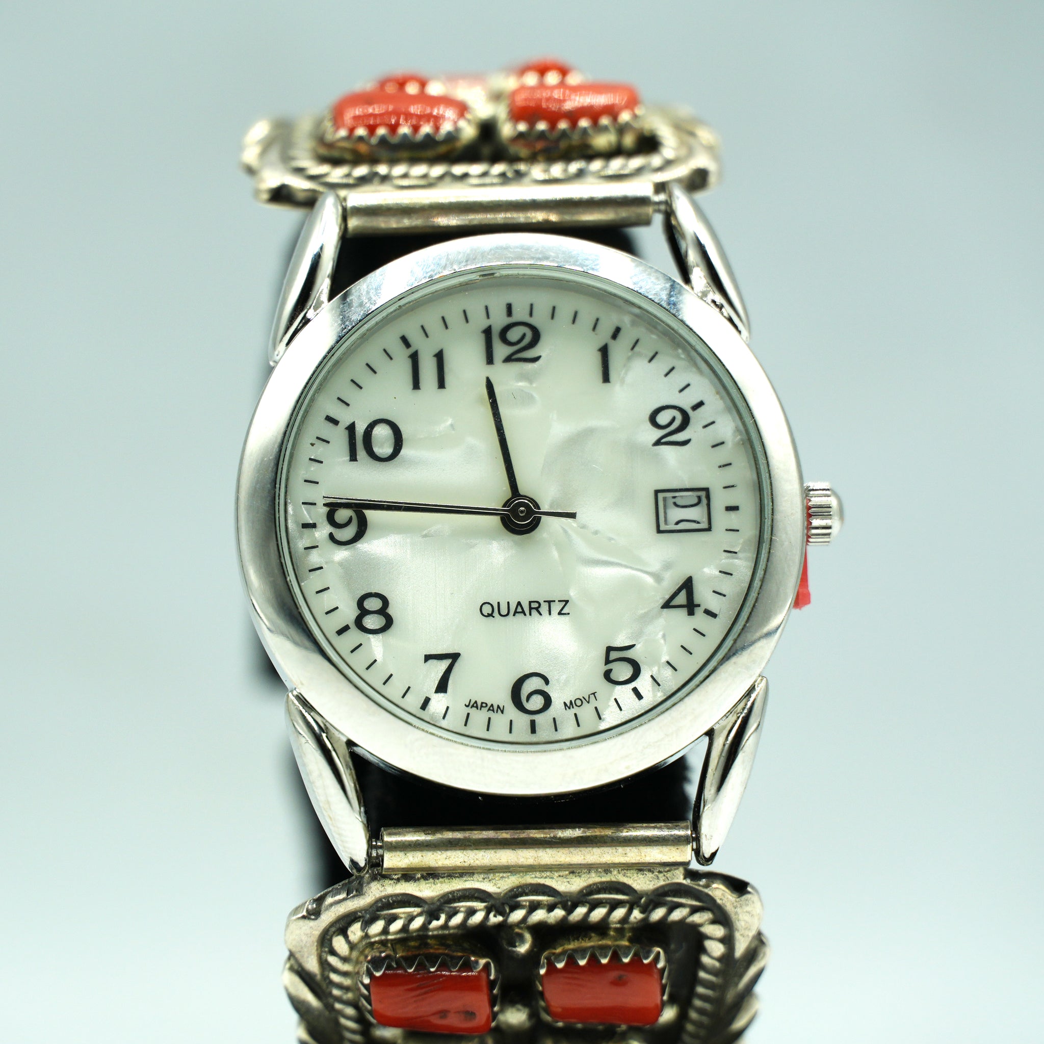 Navajo Sterling Silver Watch with Mother of Pearl Face and Coral – Handcrafted Sterling Silver