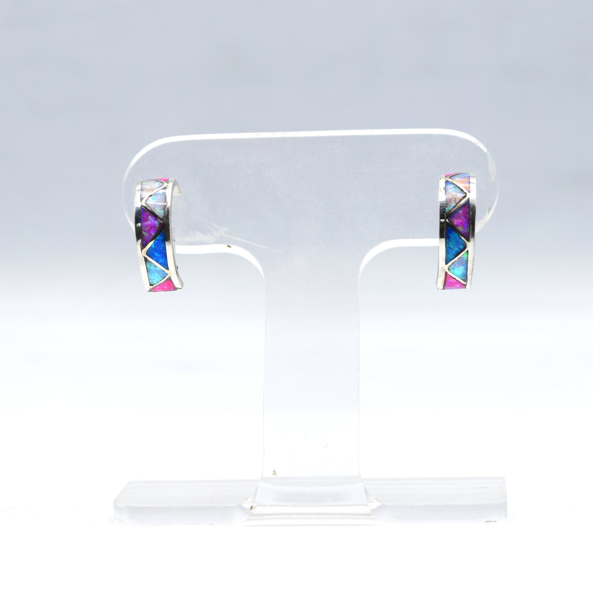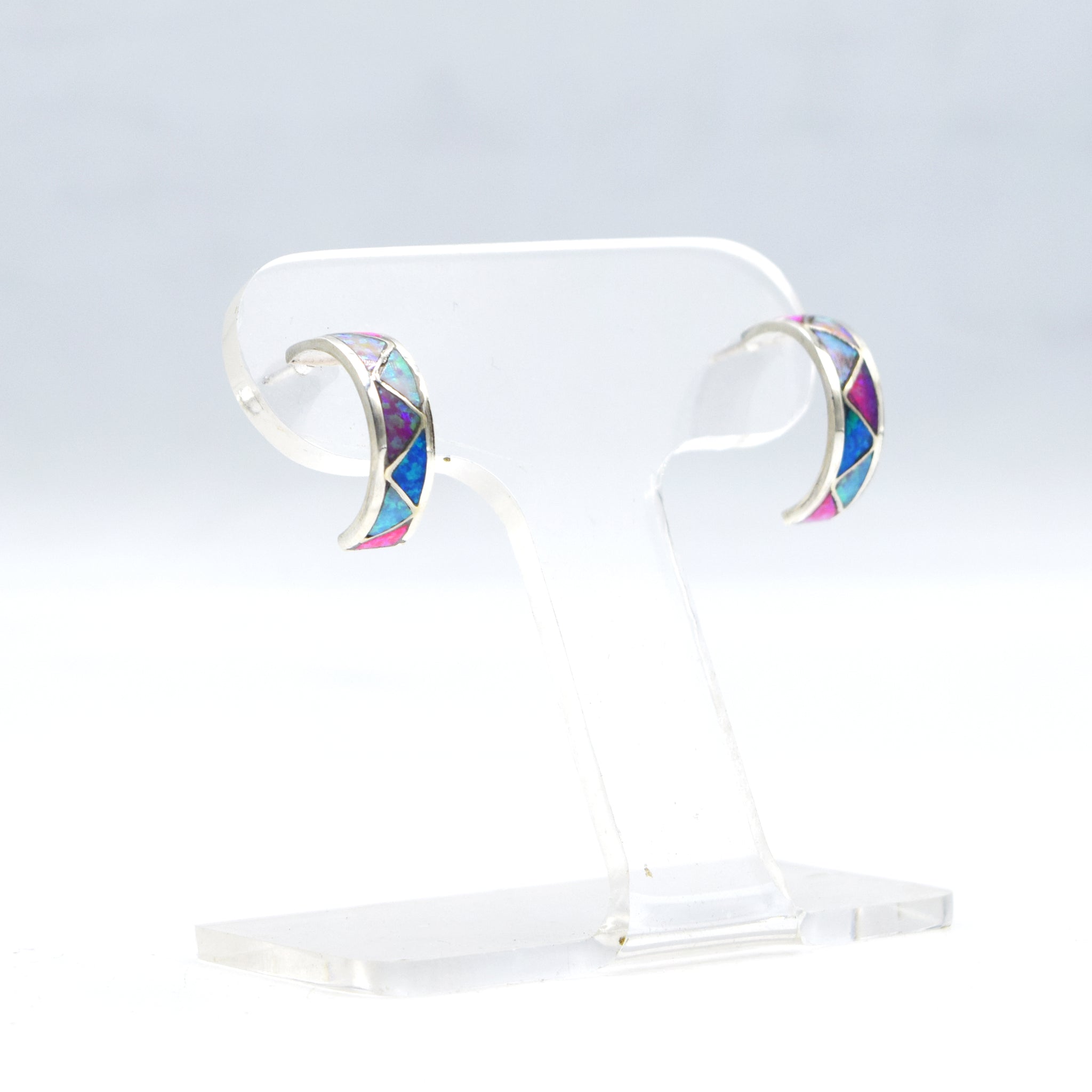 These striking Zuni half hoop earrings are a celebration of vibrant color and expert craftsmanship. Crafted from polished sterling silver, each hoop features a smooth, seamless channeled inlay of shimmering multi-color synthesized opal, reflecting flashes of blues, greens, pinks, and purples that dance with every movement.